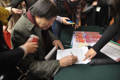 圖為全國政協(xié)委員馮驥才一邊辦理報到手續(xù),一邊回答記者提問。人民網記者趙敬菡攝