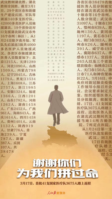 在一張紀念這一刻的海報上,一個白大褂的背影,安靜地走出“湖北”地圖。兩側(cè)打開的“大門”,布滿了各省馳援醫(yī)護人員的密密麻麻的數(shù)字。一行大字,成為逆行者剛剛跨越的那道“門坎”:謝謝你們,為我們拼過命。