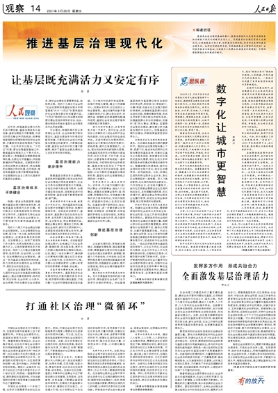 基層是社會(huì)治理的基礎(chǔ)和重心,基層治理現(xiàn)代化是國家治理體系和治理能力現(xiàn)代化的題中應(yīng)有之義。實(shí)現(xiàn)基層社會(huì)穩(wěn)定有序又充滿活力,必須凝聚各方面力量,創(chuàng)新基層治理體制,培育形成良好的基層治理生態(tài)。如何運(yùn)用好各種手段,實(shí)現(xiàn)推進(jìn)基層治理現(xiàn)代化目標(biāo)?如何夯實(shí)基層治理基礎(chǔ),不斷提升人民群眾的滿意度和獲得感?本期觀察版圍繞這些問題進(jìn)行探討。