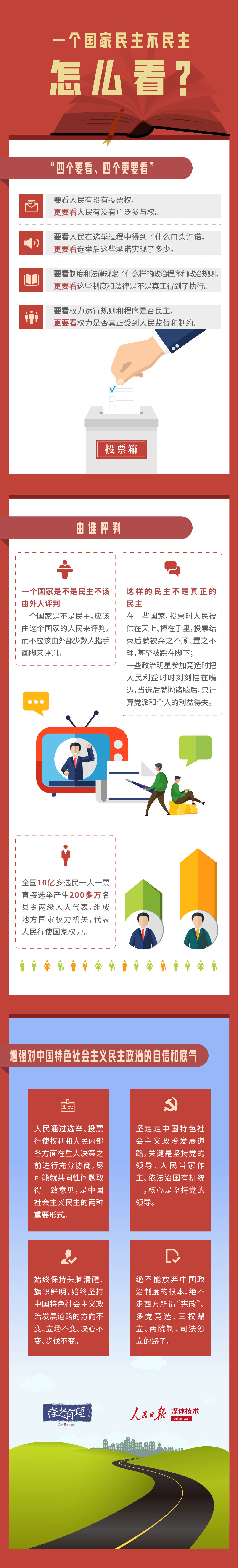 “民主是各國(guó)人民的權(quán)利,而不是少數(shù)國(guó)家的專(zhuān)利。一個(gè)國(guó)家是不是民主,應(yīng)該由這個(gè)國(guó)家的人民來(lái)評(píng)判,而不應(yīng)該由外部少數(shù)人指手畫(huà)腳來(lái)評(píng)判!绷(xí)近平總書(shū)記這些擲地有聲的重要論斷,有力回?fù)袅艘恍┪鞣絿?guó)家長(zhǎng)期以來(lái)對(duì)我國(guó)社會(huì)主義民主的傲慢攻擊和無(wú)端指責(zé),宣示了堅(jiān)定的道路自信、理論自信、制度自信、文化自信。在一些國(guó)家,投票時(shí)人民被供在天上、捧在手里,投票結(jié)束后就被棄之不顧、置之不理,甚至被踩在腳下;一些政治明星參加競(jìng)選時(shí)把人民利益時(shí)時(shí)刻刻掛在嘴邊,當(dāng)選后就拋諸腦后,只計(jì)算黨派和個(gè)人的利益得失,這樣的民主不是真正的民主。中國(guó)共產(chǎn)黨注重歷史和現(xiàn)實(shí)、理論和實(shí)踐、形式和內(nèi)容有機(jī)統(tǒng)一,把民主價(jià)值和理念轉(zhuǎn)化為科學(xué)有效的制度安排,轉(zhuǎn)化為具體現(xiàn)實(shí)的民主實(shí)踐,真正保證了中國(guó)人民當(dāng)家作主。