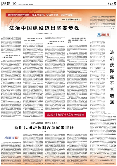 全面推進依法治國,是著眼于實現中華民族偉大復興中國夢、實現黨和國家長治久安的長遠考慮。黨的十八大以來,中國特色社會主義法治體系不斷健全,法治中國建設邁出堅實步伐,法治固根本、穩(wěn)預期、利長遠的保障作用進一步發(fā)揮,黨運用法治方式領導和治理國家的能力顯著增強。黨的十九屆六中全會《決議》深刻總結新時代在全面依法治國上取得的原創(chuàng)性思想、變革性實踐、突破性進展、標志性成果。今天刊發(fā)的3篇文章,圍繞這一主題進行闡述。